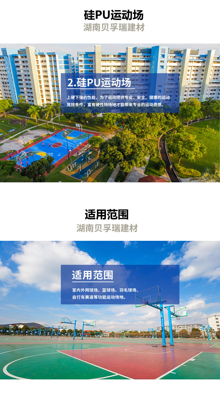 ②、超強(qiáng)的耐磨性:硅PU面層采用添加硅樹脂顆粒做法,其結(jié)構(gòu)特征恒久穩(wěn)定不變,軟硬適中,耐磨性能滿足長(zhǎng)期高使用頻率的需要。