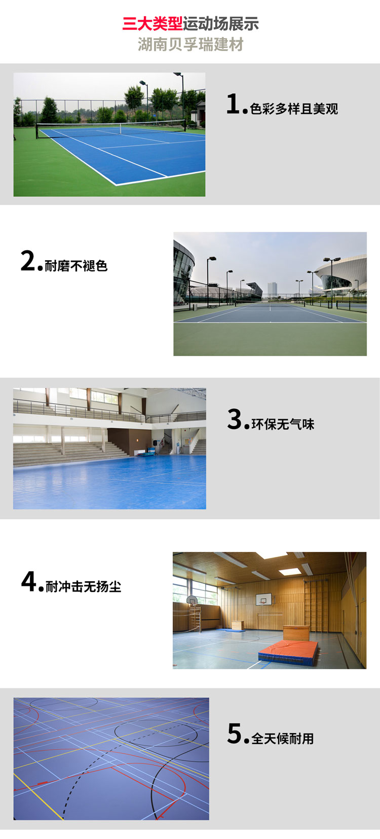 5、技術(shù)穩(wěn)定性:無論是大球還是小球的回彈性、吸震性及摩擦系數(shù)能貫穿整個(gè)場(chǎng)地系統(tǒng),保證其技術(shù)穩(wěn)定性。6、理想的綜合功能:適用于室內(nèi)外籃球場(chǎng),網(wǎng)球場(chǎng),排球場(chǎng),羽毛球場(chǎng),手球場(chǎng),休閑場(chǎng)地,健身房等多項(xiàng)運(yùn)動(dòng)地面。
